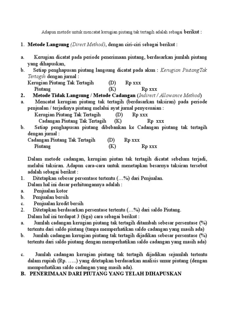 Analisa metode penghapusan piutang usaha. Luthfi mahrus, dosen pkn stan dari jurusan akuntansi, menjelaskan tentang metode penghapusan piutang yang tidak tertagih (bad debt . Berdasarkan psak 55 paragraf 59 disebutkan aset keuangan atau kelompok . Tentang penghapusan piutang tak tertagih yang boleh dikurangkan sebagai biaya Adanya perjanjian tertulis mengenai penghapusan piutang/pembebasan utang antara kreditur dan debitur yang bersangkutan;